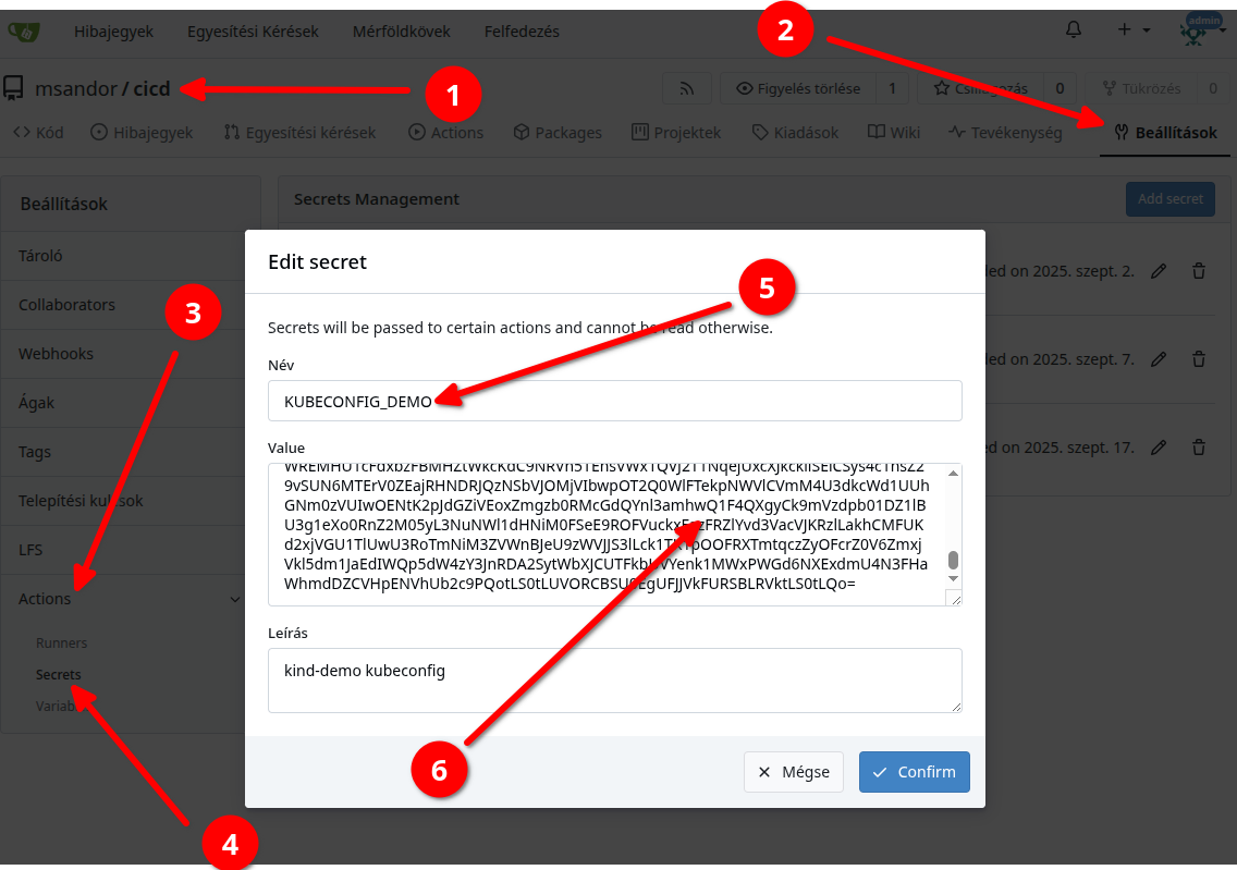 Most menjünk a gitea CICD repó beállításaihoz, majd actions -> secrets: